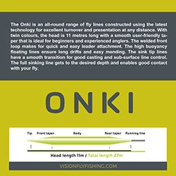 The Onki is an all-round range of fly lines constructed using the latest technology for excellent turnover and presentation at any distance. With twin colours, the head is 11 metres long with a smooth user-friendly taper that is ideal for beginners and experienced anglers. The welded front loop makes for quick and easy leader attachment. The high buoyancy floating lines ensure long drifts and easy mending. The sink tip lines have a smooth transition for good casting and sub-surface line control. Phthalate free.